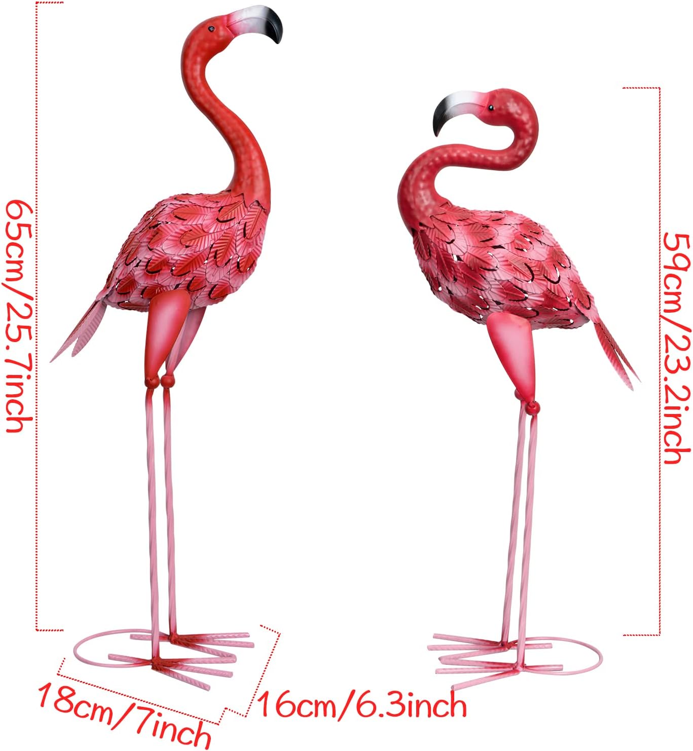 - The dimension of flamingo is 8″L x 6.3″W x 25.7″H, the other is 11″L x 6.3″W x 23.2″H. Perfect size make flamingo statues look more realistic.